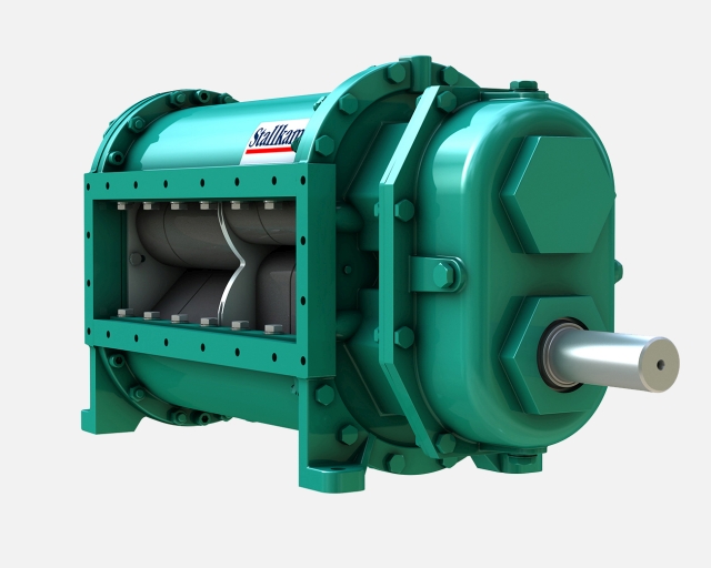 Die Drehkolbenpumpen arbeiten nach dem Verdrängerprinzip. Gegenläufige Rotoren garantieren konstantes Saugverhalten und hohen Druckaufbau. Die robusten Pumpen mit beidseitig gelagerten Antriebswellen sind selbstansaugend und schonen durch ihren schwingungsarmen Lauf Antrieb und Technik. Durch einfache Förderrichtungsumkehr und starre Druckmengen Kennlinie ideal für den Einsatz in Rohrleitungssystemen. Der modulare Aufbau ermöglicht ein Kolbenschnellwechsel System, dies ermöglicht wiederum nur kurze Standzeiten und extreme Langlebigkeit.