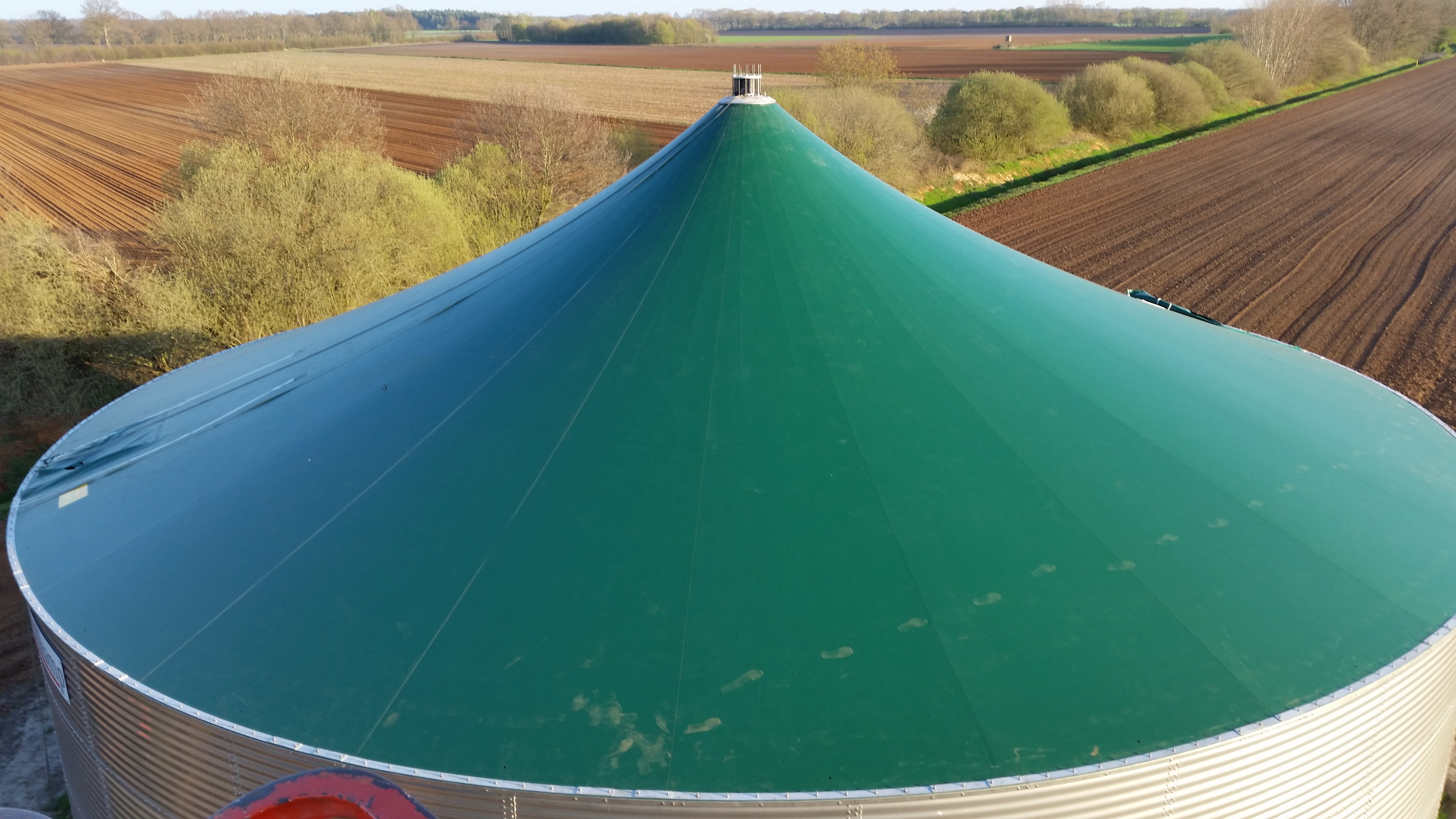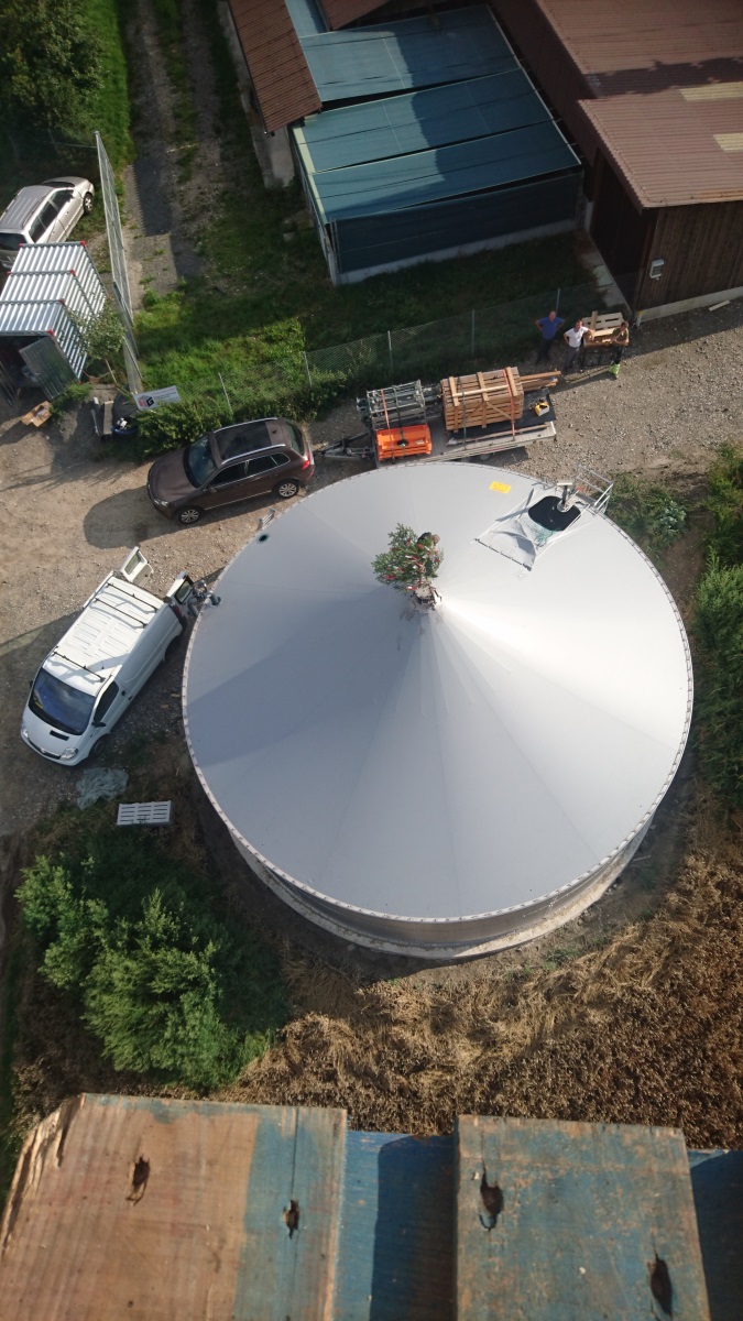 - Mithilfe von Edelstahl-Befestigungsprofilen wird die Membran an dem Behälterrand befestigt und durch Aufbringen der erforderlichen Zugkraft mit dem System zur Dachspannung (Hochpunktkopf) vorgespannt