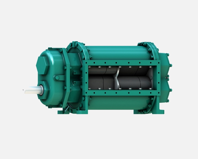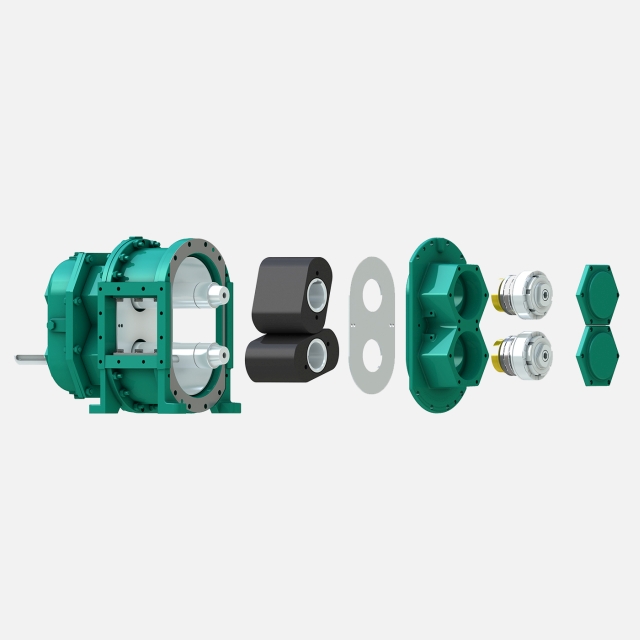 Die Drehkolbenpumpen arbeiten nach dem Verdrängerprinzip. Gegenläufige Rotoren garantieren konstantes Saugverhalten und hohen Druckaufbau. Die robusten Pumpen mit beidseitig gelagerten Antriebswellen sind selbstansaugend und schonen durch ihren schwingungsarmen Lauf Antrieb und Technik. Durch einfache Förderrichtungsumkehr und starre Druckmengen Kennlinie ideal für den Einsatz in Rohrleitungssystemen. Der modulare Aufbau ermöglicht ein Kolbenschnellwechsel System, dies ermöglicht wiederum nur kurze Standzeiten und extreme Langlebigkeit.