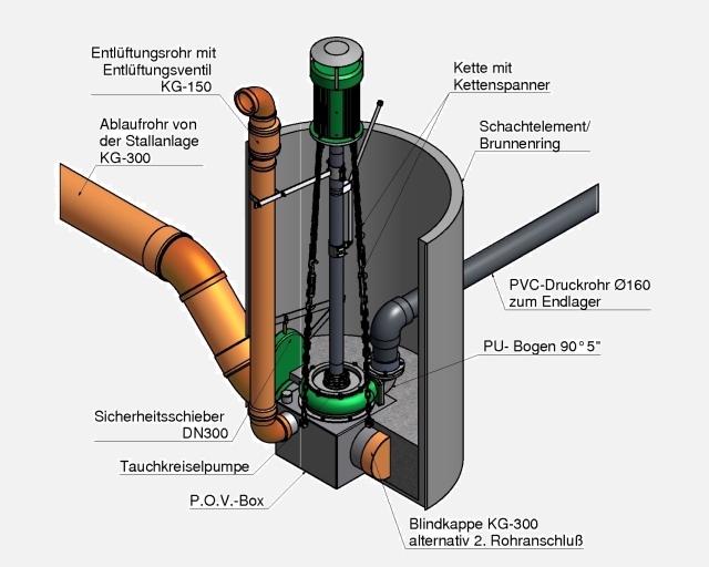 Bei Rohrentmistungssystemen kann die Langwellenpumpe mit einer P.O.V.-Box (Pumpen Ohne Vorgrube) ausgestattet werden. Die P.O.V.- Box wird direkt in die Rohrleitung eingebaut. Durch den „Unterflur“-einbau der P.O.V.- Box ist das Güllesystem frostsicher. Weiterhin kann die Box auch am Güllelager für die Befüllung genutzt werden